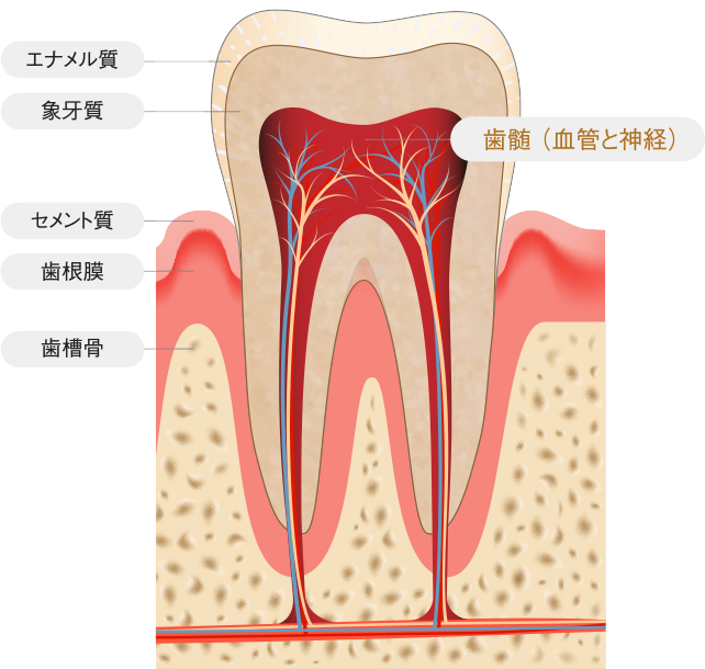 歯の内部はエナメル質、象牙質と呼ばれる硬い層の下に歯髄と呼ばれる軟組織が存在します。歯髄は神経や血管などを含み、虫歯などによって細菌感染が生じることがあります。