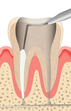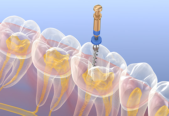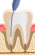根管治療の処置は、専用の治療器具を使用します。細長い歯の管を通り、感染部を除去できる柔軟性に優れたニッケル・チタンファイル使い、超音波振動や次亜塩素酸ナトリウムで隅々まで洗浄・消毒し、特殊なセメントで細菌の侵入を防ぎ、歯の残存確率を高めます。