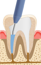 根管内に洗浄液を注入するだけでなく、超音波発生装置で、振動により洗浄液が根管の先端まで到達するようにし、根管の隅々まで洗浄します。