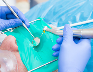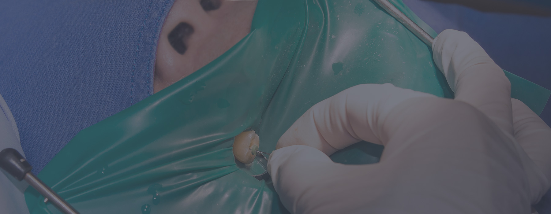 ゴムのシートを使用して、治療する歯だけ露出するラバーダム防湿で、根管内に細菌が侵入するのを防ぎ、薬液を適切に充填します。