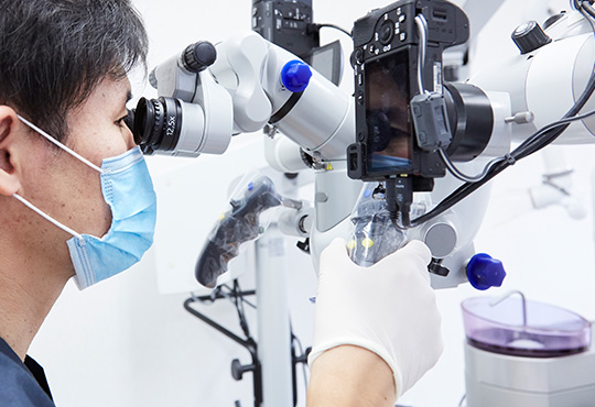 歯の内部における根管は、一人ひとり形状、根の枝数、湾曲度、異物の位置や穴など異なり、複雑な構造をしているため、歯科用コーンビームCTの3次元立体映像で、根管内の構造を精緻に把握します。疾患部の神経を取り除き、洗浄するためには、精密に治療を行う必要があるため、治療中はマイクロスコープで患部を拡大し、より確実な処置を実現します。