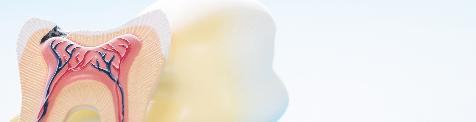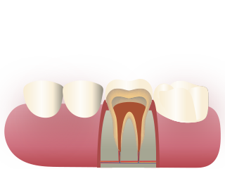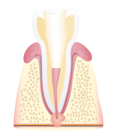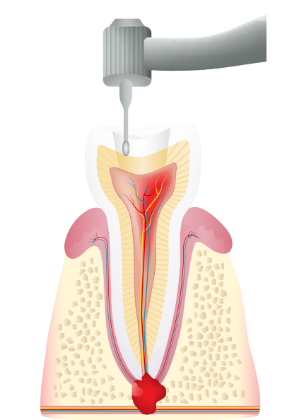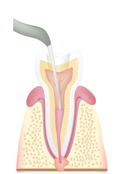 歯の神経にむし歯が達し、根管内が細菌感染を起こしている状態。汚染された神経は取り除かなければ侵襲を止めることができないため、完全に除去する必要があります。神経を取る(抜髄)処置は初回根管治療と言われ、適切な条件下で処置すれば高い成功率が期待できます。