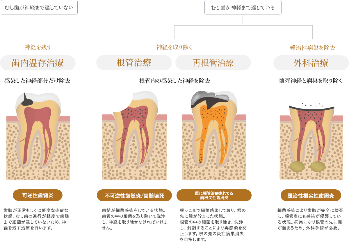 歯髄(神経)の感染侵襲具合で、治療内容は変わります。神経が残せる状態か、全て取り除かなければいけないか、また、病巣(膿)が発生して外科手術が必要かなど、様々な治療の選択肢があります。